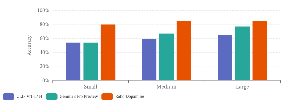 更关键的是,在最具挑战性的 Small-hop 区间,优势会进一步扩大。Robo-Dopamine 的平均准确率达到 0.80;另外两个 PRM judge 也达到 0.61 和 0.63。相比之下,Gemini 在该区间为 0.54,GPT-5.2 为 0.47。论文据此指出,当比较尺度变得足够细时,粗粒度语义线索的帮助会下降,而真正与物理过程相关的进度监督会体现出更明显优势。