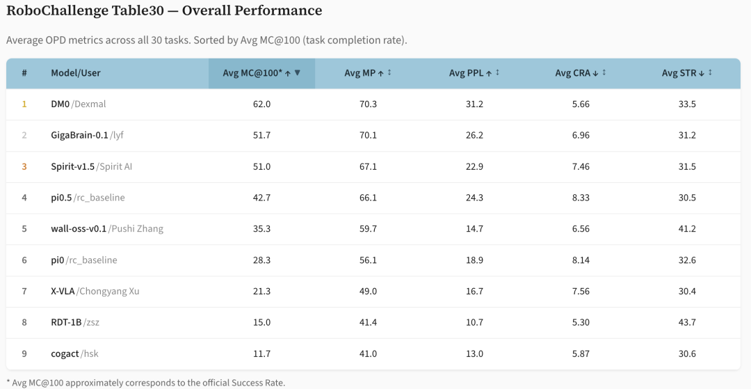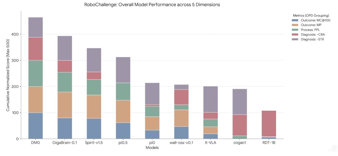 OPD 指标下的 RoboChallenge Table30 总榜:DM0 拥有最高的 Avg MC@100,Avg MP 和 Avg PPL,其成功来自更高水平的推进深度和执行质量;GigaBrain-0.1 则呈现出 “最后一公里” 差距。详细指标见官方博客:https://prm-as-a-judge.github.io/leaderboard.html