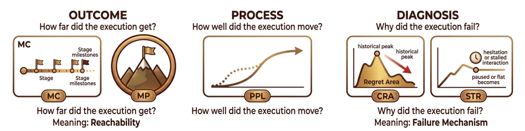 OPD 将一次执行分解为三层信号:Outcome 刻画推进深度,Process 刻画执行质量,Diagnosis 刻画失败机制。五个核心指标 MC、MP、PPL、CRA 与 STR 分别对应阶段可达性、最大进度、路径效率、回退代价与停滞比例。
