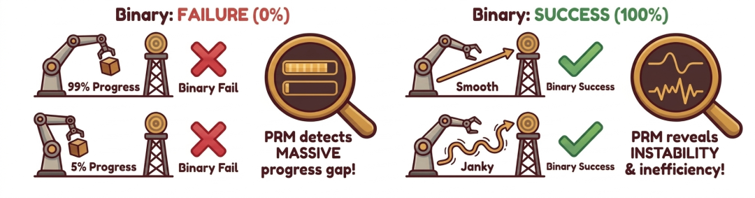 首先是分辨率不足。二元标签只能回答 “最终是否成功”,却无法刻画轨迹内部的关键差异。一个已经接近完成、却在最后阶段失手的轨迹,与一个在早期就明显偏离目标的轨迹,往往都会被统一记为失败。这样一来,不同方法在任务推进深度上的真实差异就被压缩掉了。