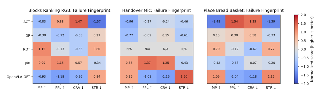 失败指纹图:在失败样本上,CRA 与 STR 将 failure 从单一终局标签进一步拆解为不同机制:有些策略更接近晚期失稳与明显回退,有些策略则更表现为长时间停滞和推进不足。相同的 “失败” 标签背后,可能对应完全不同的原因。