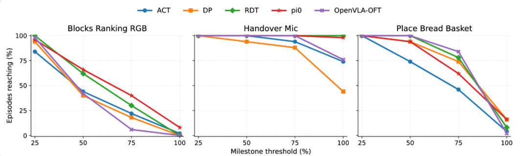 但这并不意味着它在总体上最可靠。结合 Outcome 层结果可以看到,DP 在 Handover Mic 上的 MC@100 只有 44,而另外一些策略则达到 98 甚至 100。论文据此指出:成功条件下的高质量执行,不必然等于更高的总体可靠性。 有些方法在 “成功时” 做得非常漂亮,但它们在失败时,完全没有从错误中恢复的能力。