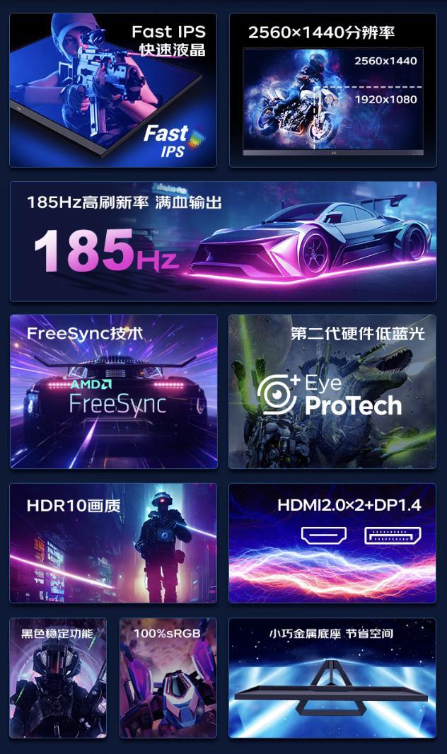 该机配备一块 2560x1440 分辨率 185Hz 超频(原生 180Hz)Fast IPS 面板,显示器 GtG 响应速度 1ms,静态对比度 1000:1,亮度 300 尼特,支持 8-Bit 色彩,覆盖 100% sRGB 色域。